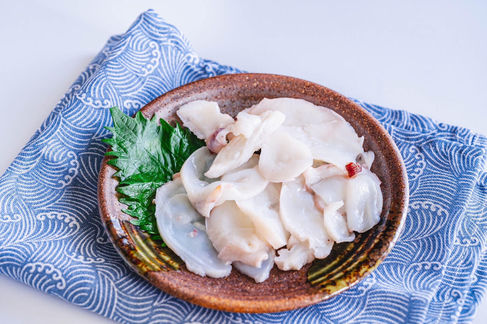 旨味凝縮!タコしゃぶ:昆布出汁にくぐらせ、半生の状態をポン酢で。生とは違う、キュッと引き締まった食感と甘みの変化が楽しめる贅沢な食べ方です。