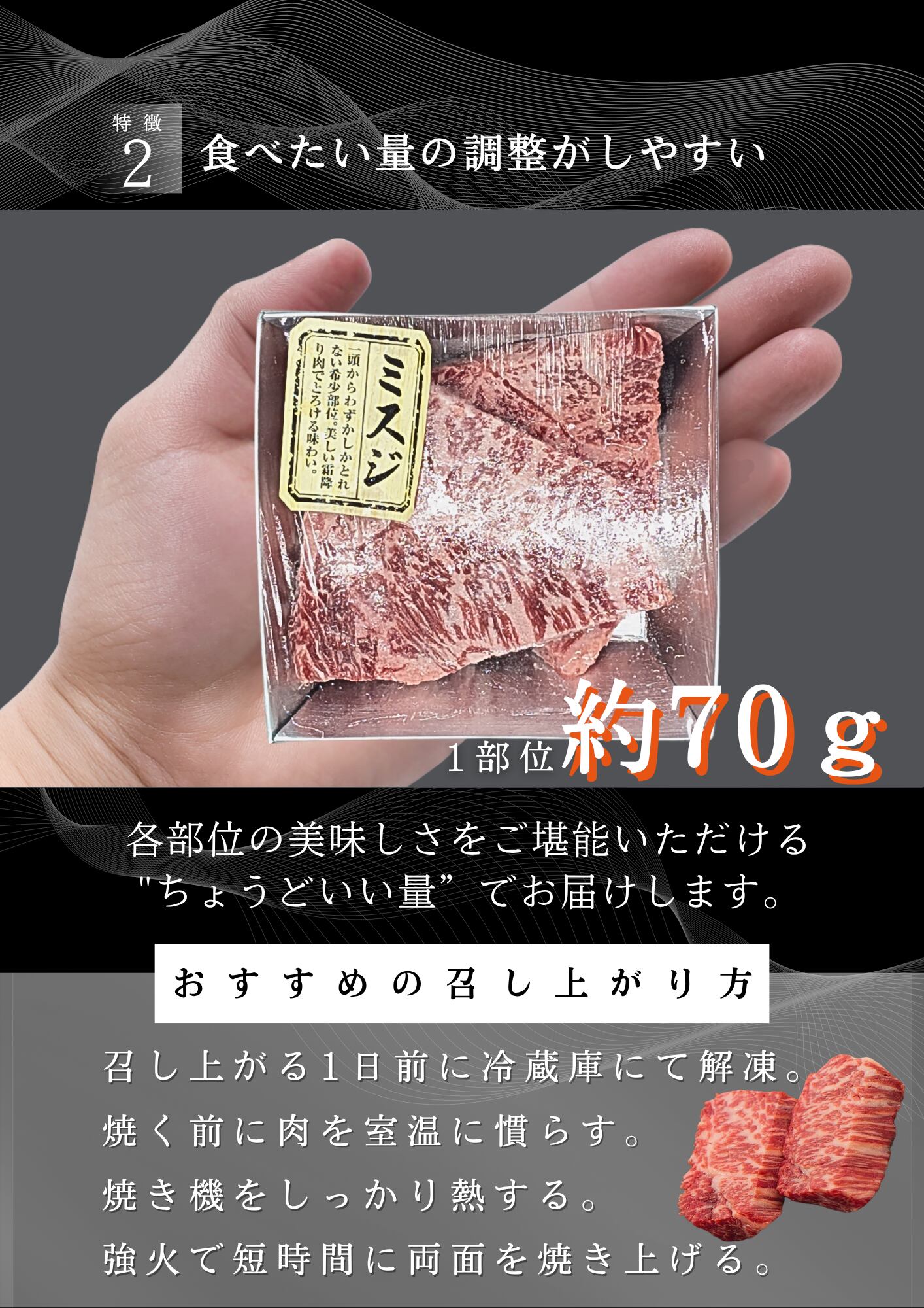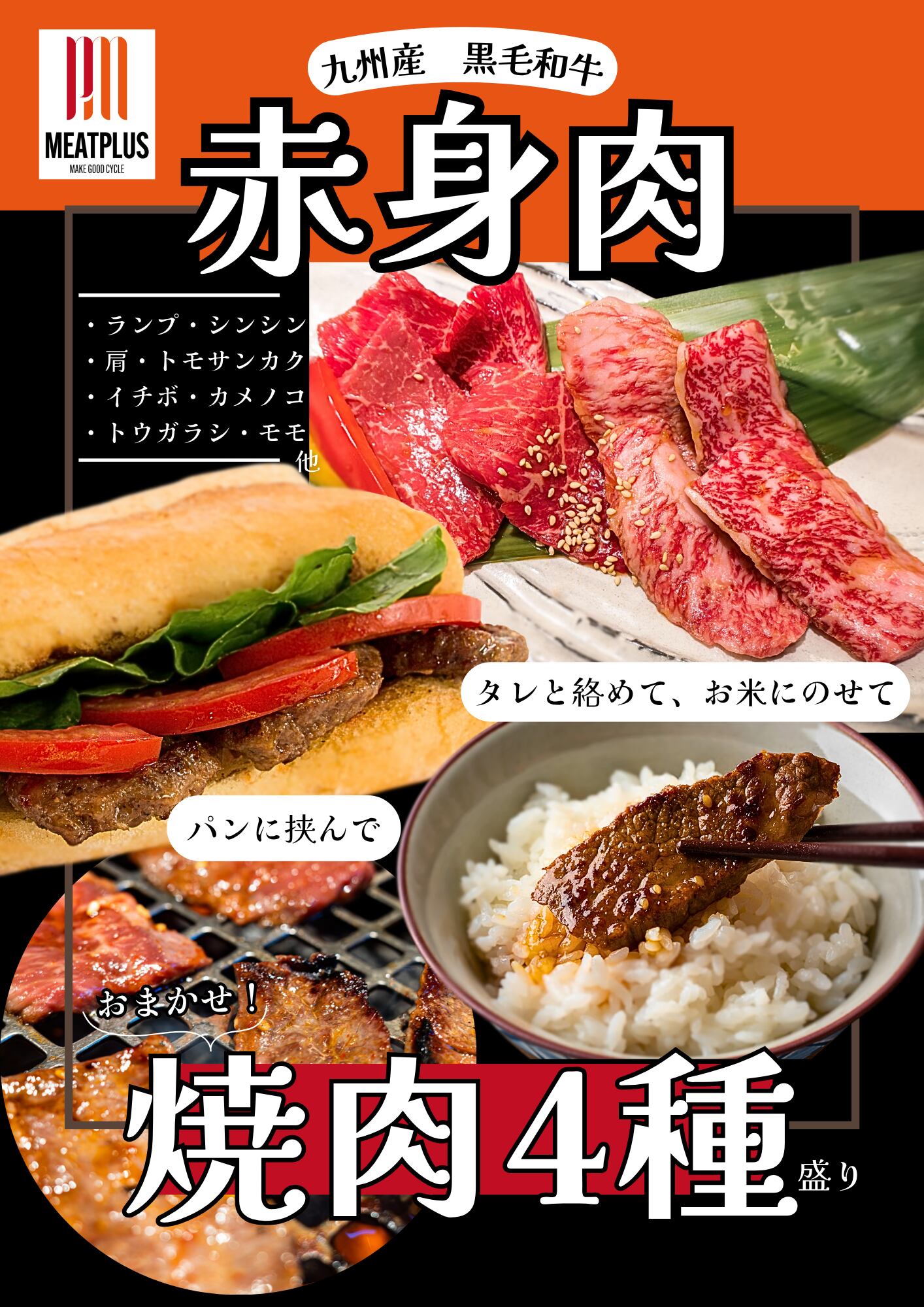 部位は、その日仕入れた部位(モモ・肩・イチボ・トモサンカク・ランプ・トウガラシ・シンシン・カメノコなど焼肉店でもなかなか出会えない部位まで網羅。)の中から弊社MEAT PLUSが厳選してお届け致します!