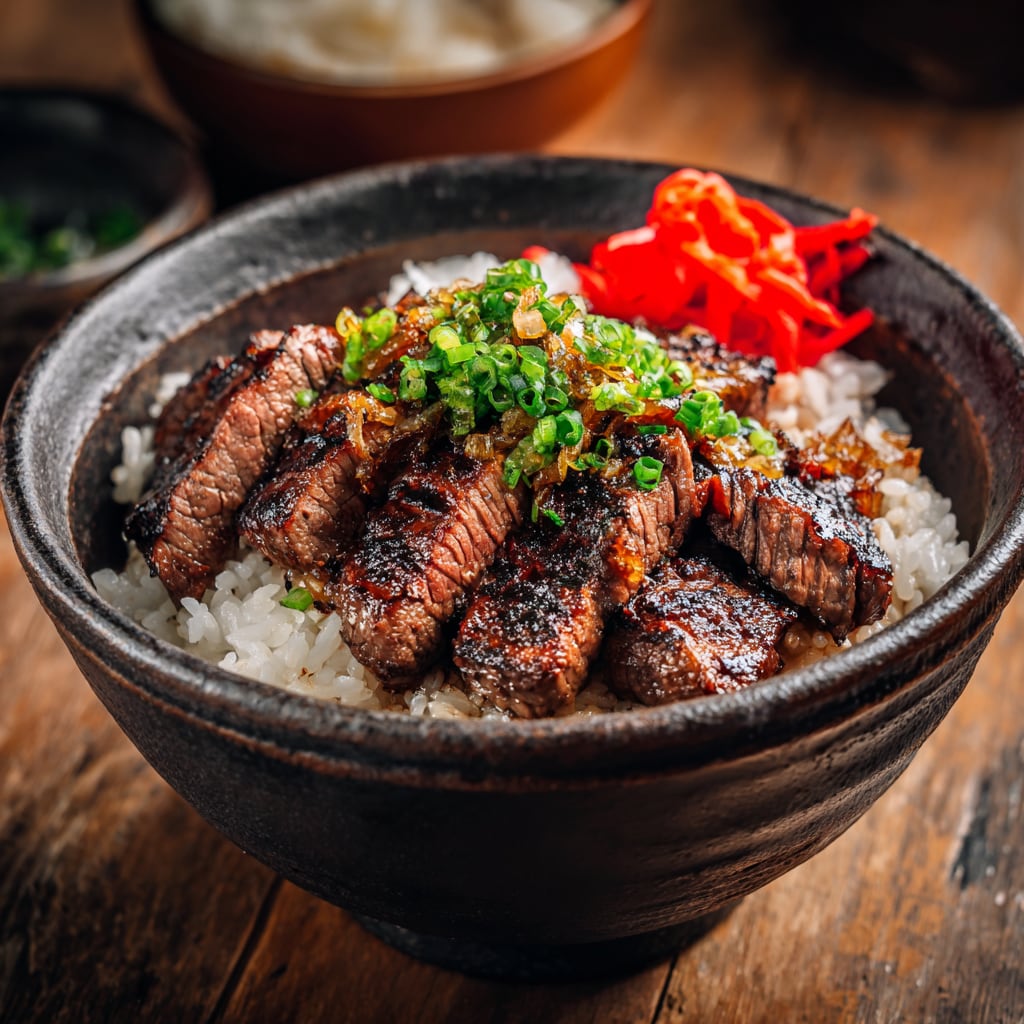 ・特製焼肉丼:熱々ご飯にのせて卵黄をトッピング