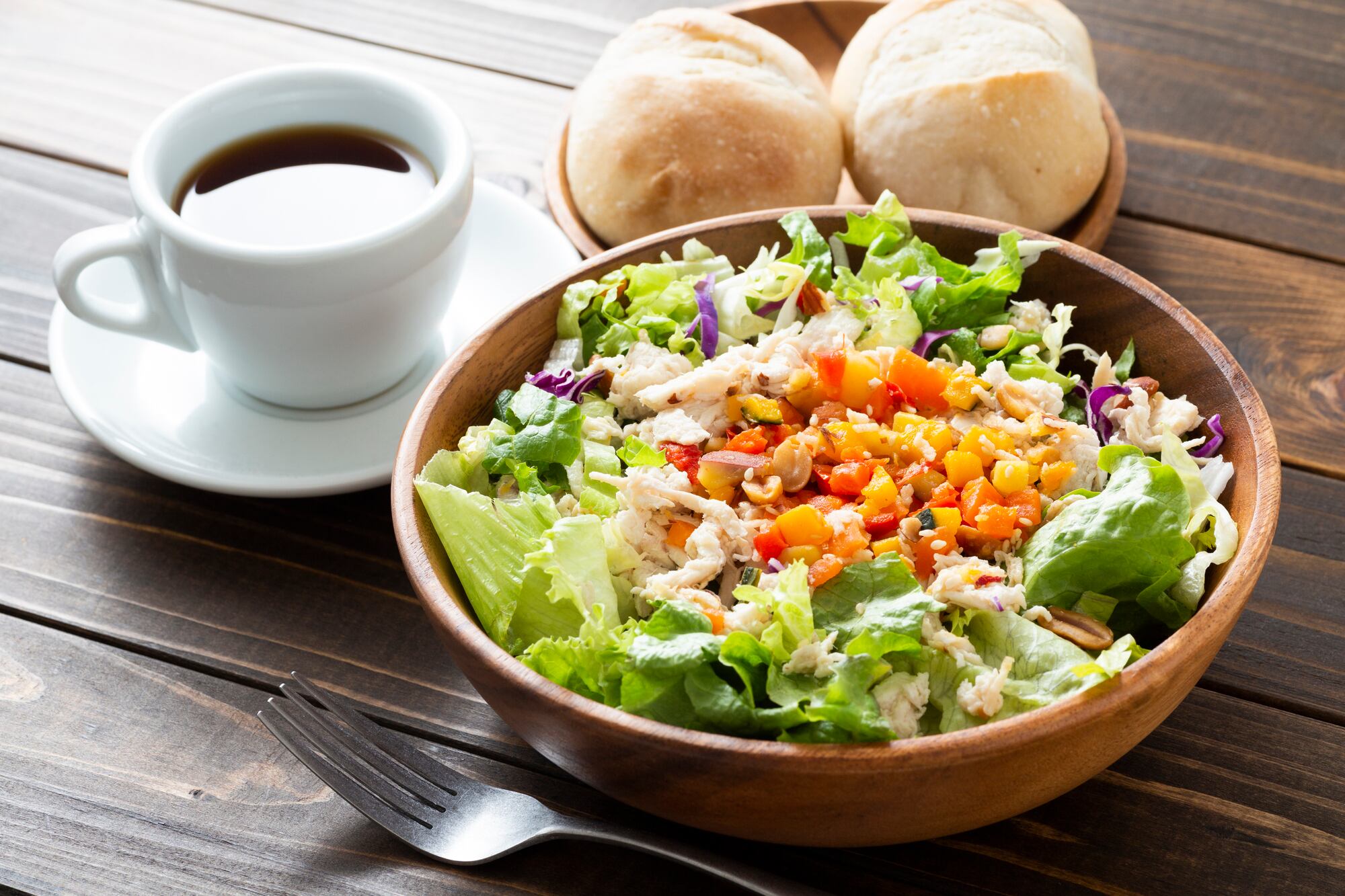 レタス・トマト・コーン・ゆで卵の上に、解凍した蒸し鶏ほぐしをどっさりオン。和風ドレッシングやシーザードレッシングと合わせて、満足感のあるサラダごはんに。